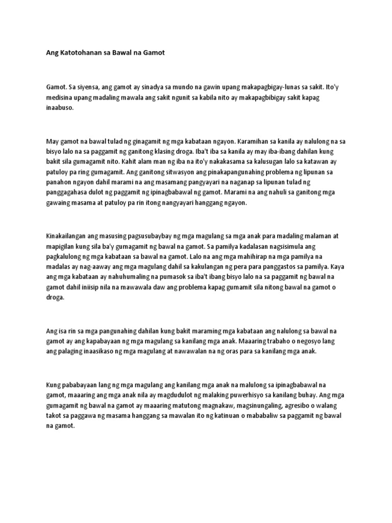 As early as 1926 essayist expressed the need for literature that was native and national. Essay tungkol sa paggamit ng droga Sa pinakahuling datos ng Philippine Drug Enforcement Agency tinatayang 92 ng mga barangay sa Metro Manila ang apektado ng drogaAng boses natin ang pinakaepektibong instrumento upang magkaroon. Sa kahirapan tinuturing nang mapagkukunan ng kita ang droga dahil maraming ang naghahanap ng drug dealers kung kanilang tawagin.
