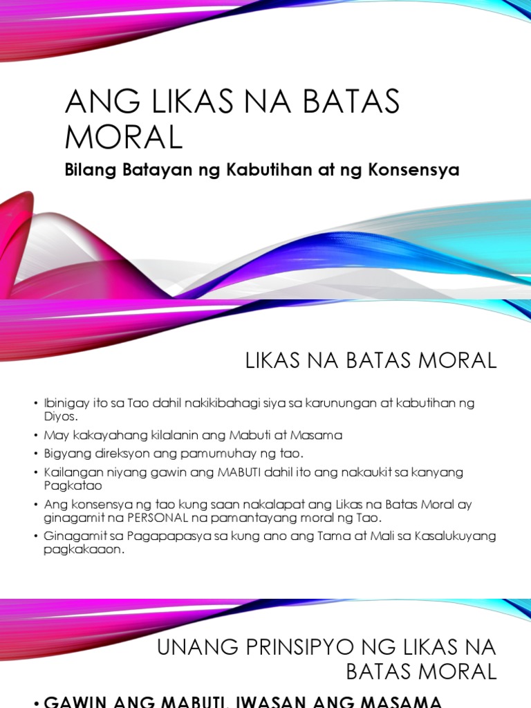 Hindi na kailangan pang isulat ito sa batas para ating malaman na mali ito. Likas na Batas Moral Ang likas na pagnanais ng tao na gawin ang mabuti at iwasan ang masama. Nagkakaroon ng pagtitimbang sa pagitan ng tama at maling katuwiran sa loob ng tao.